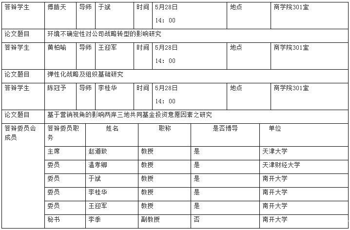 根据《南开大学关于2017-2018学年度第二学期毕业研究生论文评审及答辩工作的通知》规定,现将我院博士生傅皓天、黄柏喻、陈冠宇学位论文答辩会公告如下: