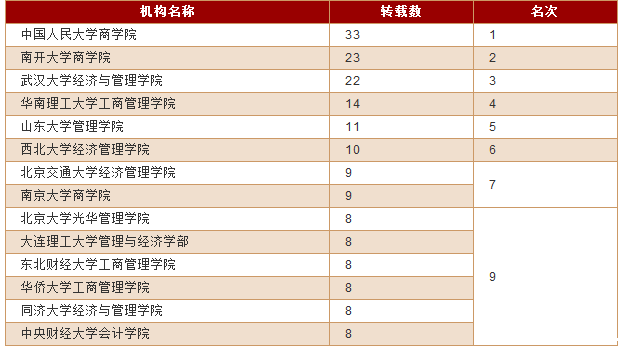 本次论坛发布的两项成果由中国人民大学人文社会科学学术成果评价研究中心与中国人民大学书报资料中心联合研制,在2016年度转载指数排行中,共有500余种人文社科期刊和300余家作者机构榜上有名,南开大学商学院以总转载次数23次位居高等学校二级学院工商管理学科(机构指数)第二名;工商管理学科以总转载次数31次在高等院校分学科(机构指数)排名第二。值得一提的是,自2009年采用新的学科分类方法至今的八次调查中,以高等学校二级学院为参评单位的评比中商学院共获得两次第一、三次第二;以学科为参评单位的评比中工商管理学科共获得一次第一、两次第二、一次第三。