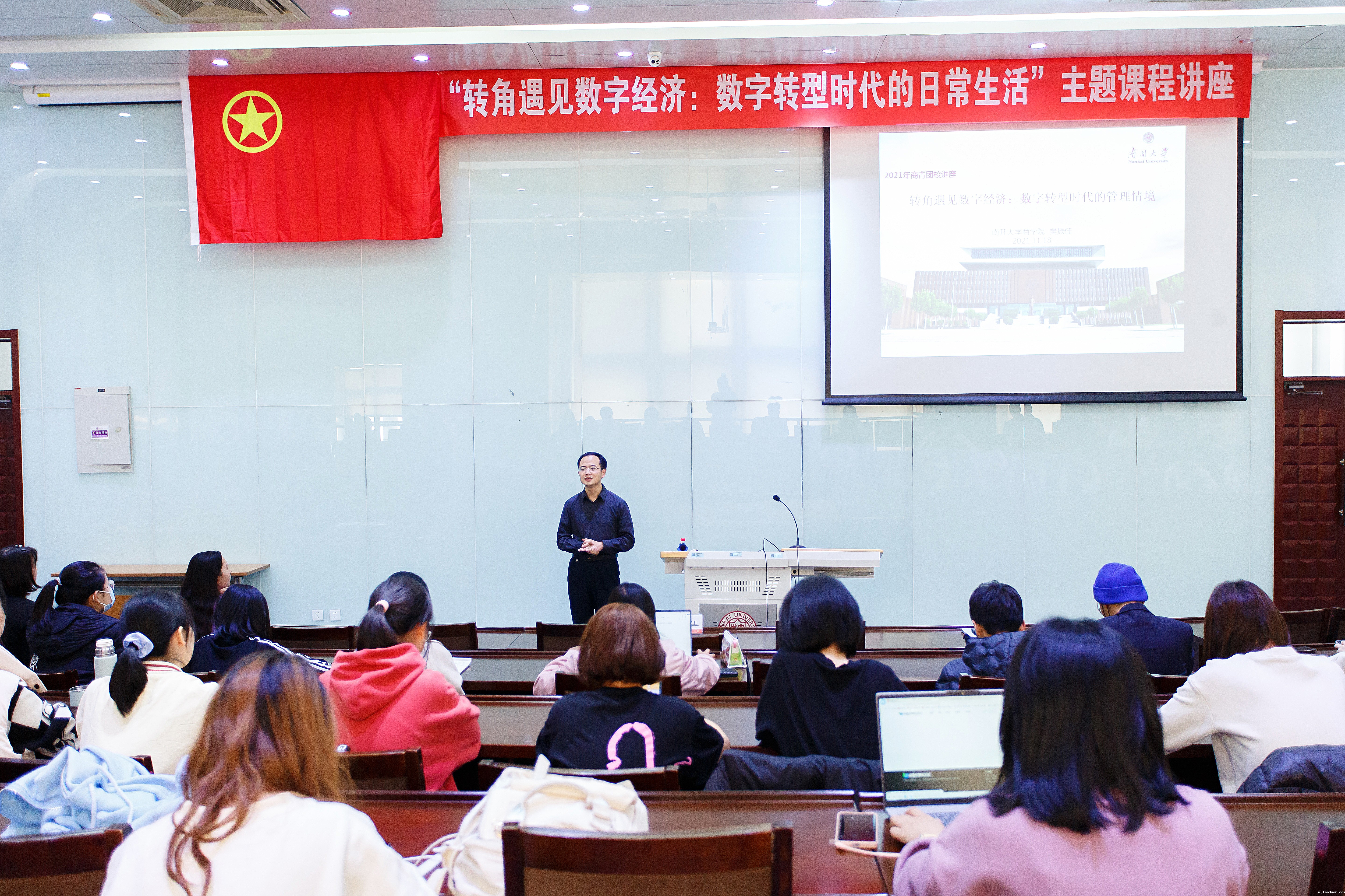 2. 注重能力培养,提高综合素质。为加强学生自我认知能力和自我管理能力,10月28日,商青团校在商学院大报告厅举行“自我认知与提升,时间管理与规划”主题课程,南开大学化学学院辅导员张佳庆老师受邀主讲。此次讲座使学生认识到主动、行动、坚持是突破迷茫的重要关键,也学习到时间规划和管理、对待自我认知与外部评价的关系的方法。此外,为促进学生紧跟时代潮流,提高学生专业素质能力,11月18日,商学院举办了“转角遇见数字经济:数字转型时代的日常生活”主题课程,南开大学商学院副教授樊振佳老师受邀主讲。本次课程增进了同学们对于数字化理论的了解、数字经济的广泛应用以及数字化未来发展前景,提高了专业能力和视野。