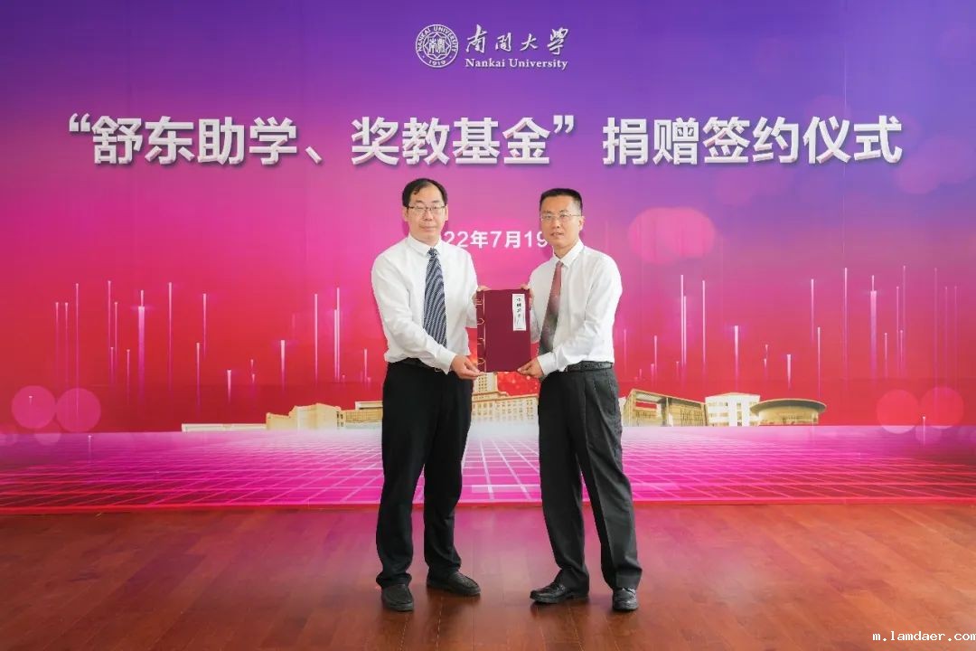 7月19日,南开大学舒东助学、奖教基金捐赠签约仪式在八里台校区海冰楼举行。常务副校长许京军、校党委副书记牛文利,我校1988级企业管理专业本科校友、广东中显律师事务所创始人舒东,舒东校友在校期间辅导员、医学院退休教师赵金芳出席捐赠签约仪式。
