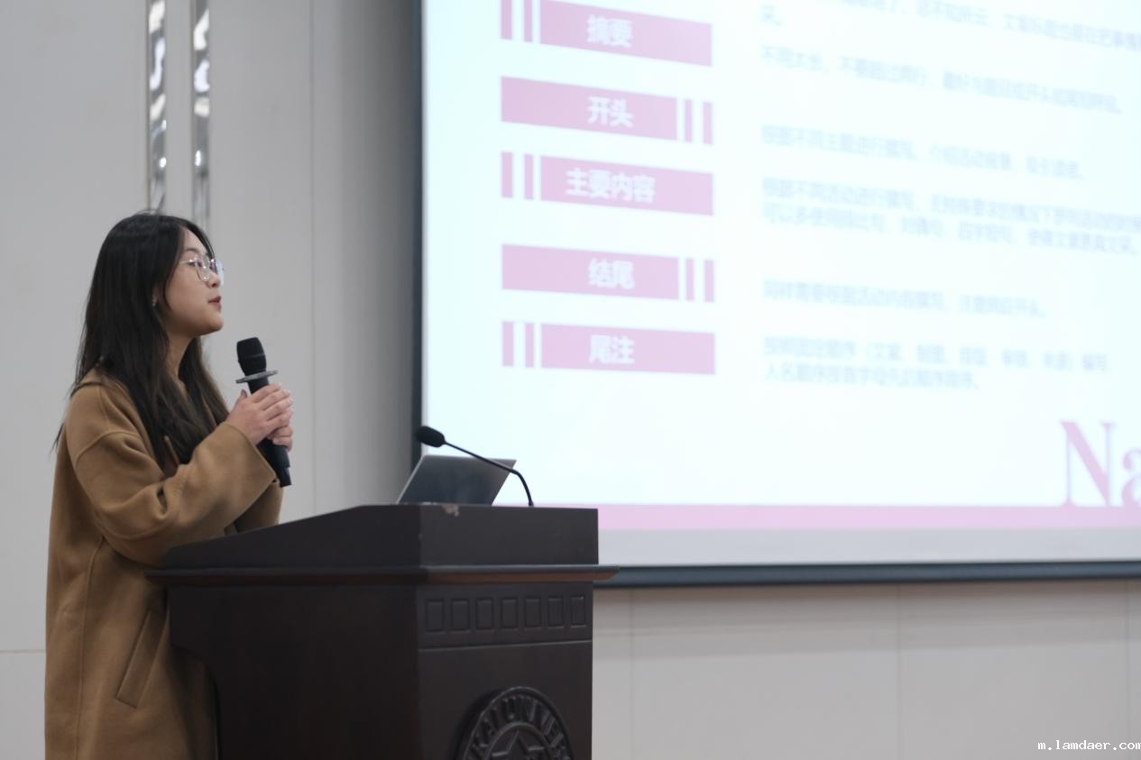接着,南开大学团委学生课外活动指导中心分管宣传副主任刘思妍为学员传授了宣传技能经验,从文案的各个部分以及相关软件的使用等方面给了予同学们专业严谨的指导,让同学们对于文案的撰写有了更加深入的认识,为班委日常工作的推进提供了指导。