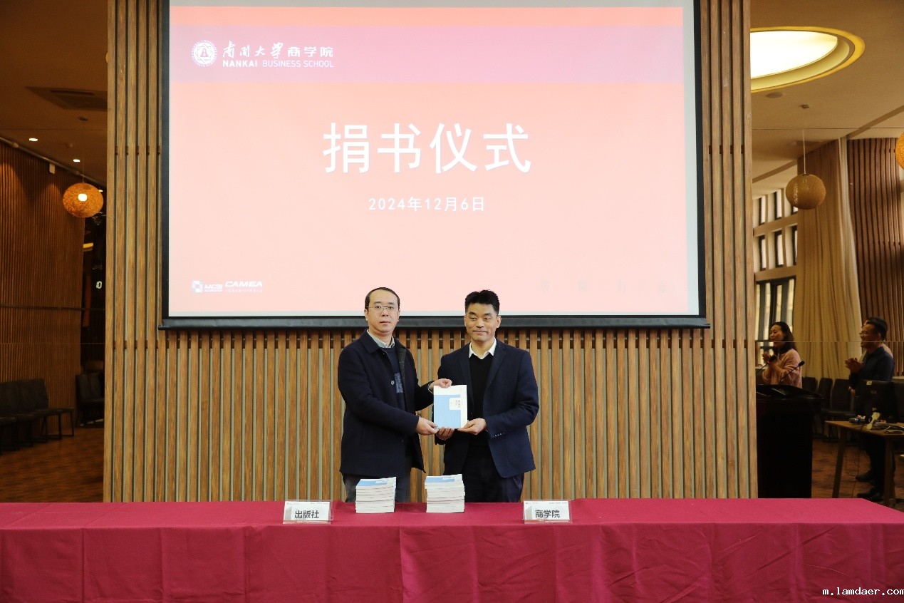 为丰富学院图书馆藏,为老师们的教学科研以及同学们的学习提供更为丰富的资源,会议伊始,南开大学出版社张玮副社长代表出版社,将《叶嘉莹谈词(第二版)》、《天津租界档案》第一辑《英租界档案》、《张伯苓全集》等一批珍贵书籍捐赠给商学院,他希望商学院师生能够珍惜书籍,用心阅读,汲取知识的养分,也希望今后商学院和出版社能强强联合、紧密合作,出版更多更好的教材和学术专著。商学院蒋金洪副院长代表学院接受捐赠,他表达了对出版社的感谢,希望青年教师多读书、读好书,尤其是通过深入阅读叶嘉莹先生的著作,学习了解叶先生的精神风骨和为师之道。