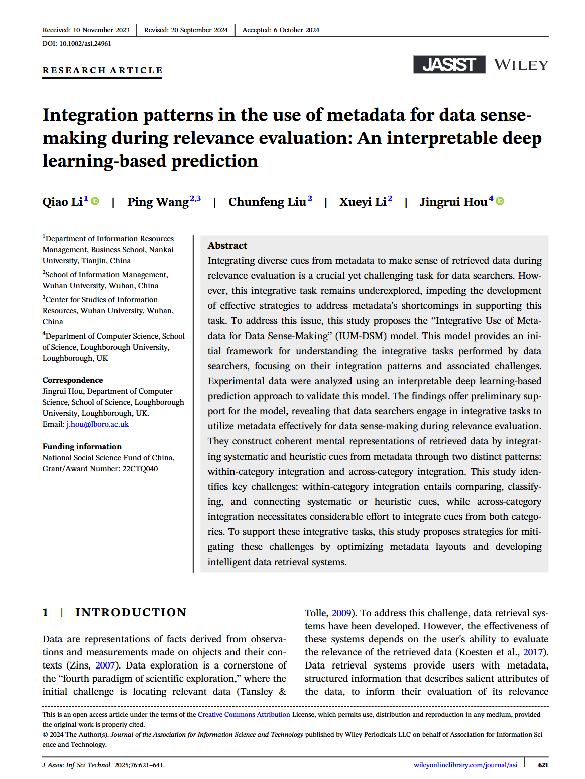 日前,南开大学商学院信息资源管理系李樵老师(第一作者)及其科研团队合作的研究论文“Integration patterns in the use of metadata for data sense-making during relevance evaluation: An interpretable deep learning-based prediction” 发表于信息资源管理学科国际顶级期刊Journal of the Association for Information Science and Technology 2025年76卷第3期。