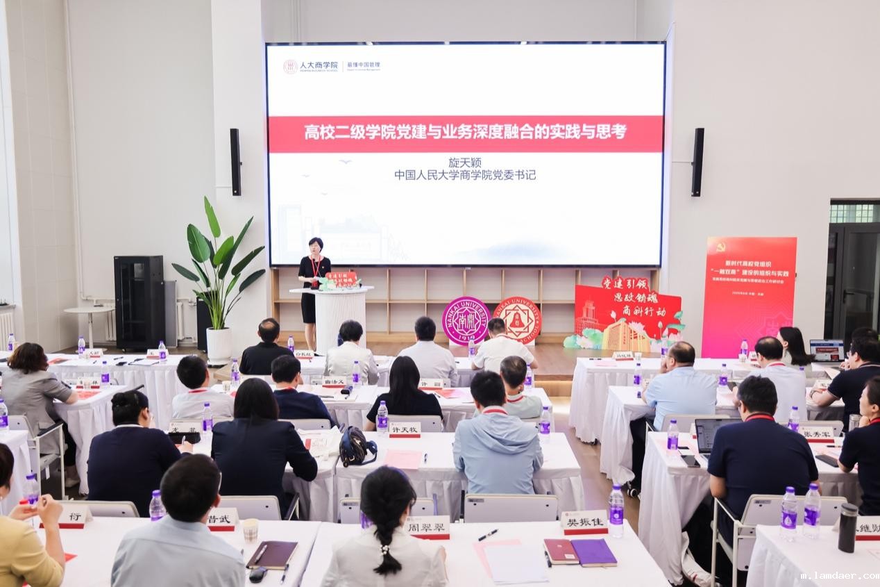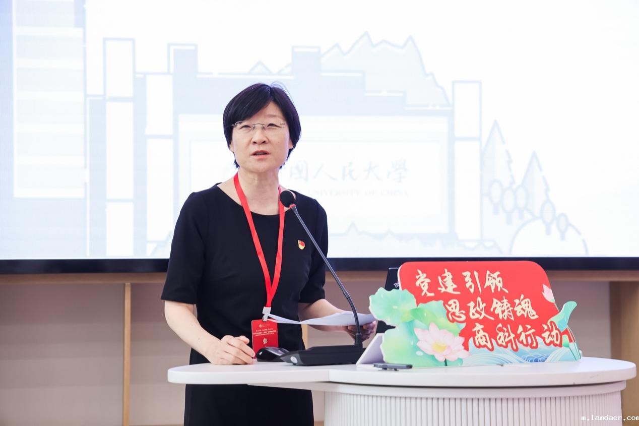 中国人民大学商学院党委书记旋天颖从“思想引领、组织统筹、队伍建设”三方面,介绍了学院推进党建与业务深度融合的经验做法,强调要以思政贯通教育全过程,提升育人实效。